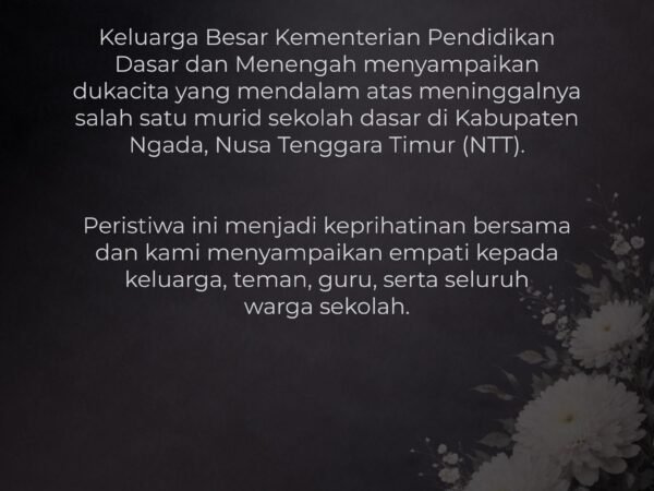 Sehubungan dengan peristiwa wafatnya salah satu murid sekolah dasar di Kabupaten Ngada, Nusa Tenggara Timur (NTT), Kementerian Pendidikan Dasar dan Menengah (Kemendikdasmen) menyatakan: Jakarta, 4 Februari 2026 sumber berita :https://kemendikdasmen.go.id/siaran-pers/14675-kemendikdasmen-turut-berdukacita-atas-wafatnya-murid-sekolah-dasar-di-kabupaten-ngada-ntt..