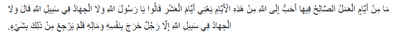 Artinya: “Tiada hari-hari yang amal shalih di dalamnya lebih dicintai Allah daripada hari-hari ini. Yakni 10 hari pertama dari bulan Zulhijjah. Mereka (para shahabat) bertanya: “Wahai Rasulullah, dan tidak juga berjihad di jalan Allah (lebih utama darinya)?”, beliau bersabda: “Dan tidak juga berjihad di jalan Allah (lebih utama darinya), kecuali seseorang yang berjuang dengan dirinya dan hartanya lalu ia tidak kembali dengan apapun.” (HR Bukhari dan Muslim)