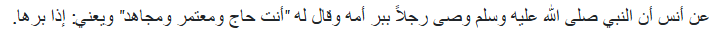 Dari sahabat Anas bahwa Nabi Muhammad SAW pernah berpesan kepada seseorang supaya berbakti kepada ibunya. Beliau bersabda : Kamu seperti berhaji, berumrah, dan berjuang di jalan Allah.