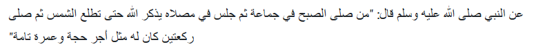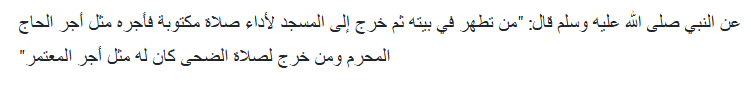 Artinya: barangsiapa bersuci di rumahnya kemudian keluar rumah untuk mengerjakan salat di masjid maka dapat pahala seperti mengerjakan haji sekali. Adapun yang mengerjakan salat Dhuha di masjid maka mendapatkan pahala sekali Umrah.
