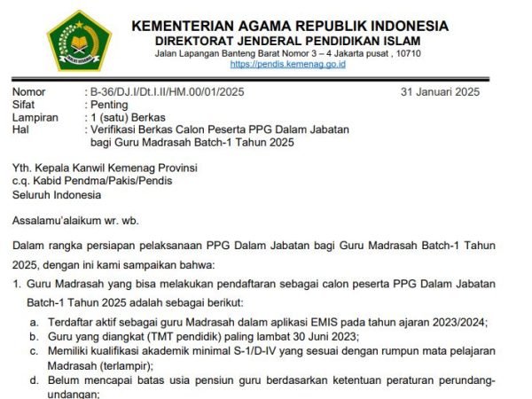 Dalam rangka persiapan pelaksanaan PPG Dalam Jabatan bagi Guru Madrasah Batch-1 Tahun2025, dengan ini kami sampaikan bahwa: