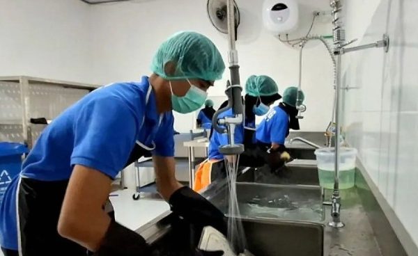 Dapur Satuan Pelayanan Pemenuhan Gizi (SPPG) Rama Indera 2 di Desa Rama Indera Kecamatan Seputih Raman, Kabupaten Lampung Tengah, melakukan pembersihan ompreng Makan Bergizi Gratis (MBG) secara berlapis untuk memastikan..