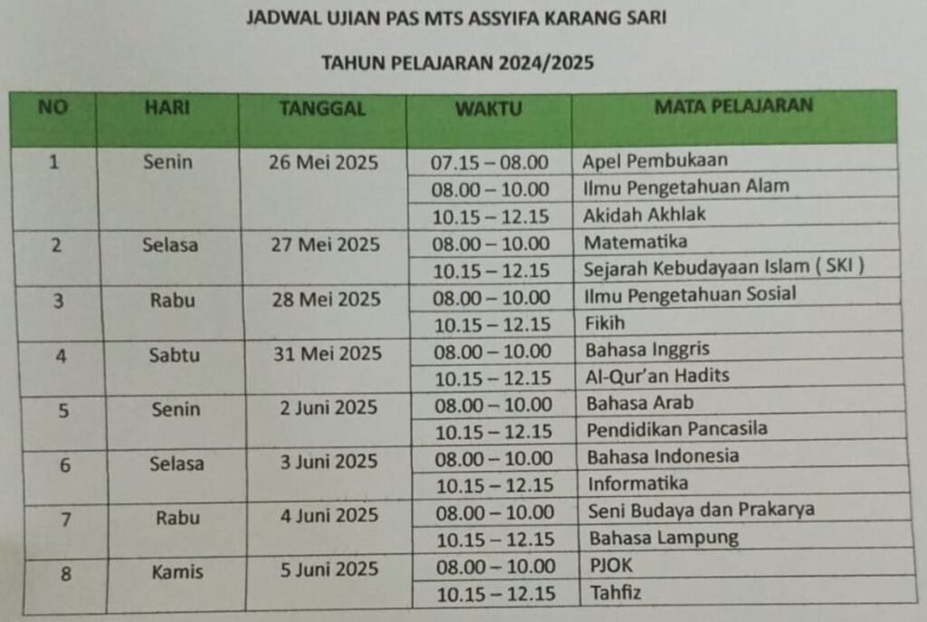Berikut ini jadwal Penilaian Akhir Tahun MTs Assyifa KArang Sari Tahun 2024/2025